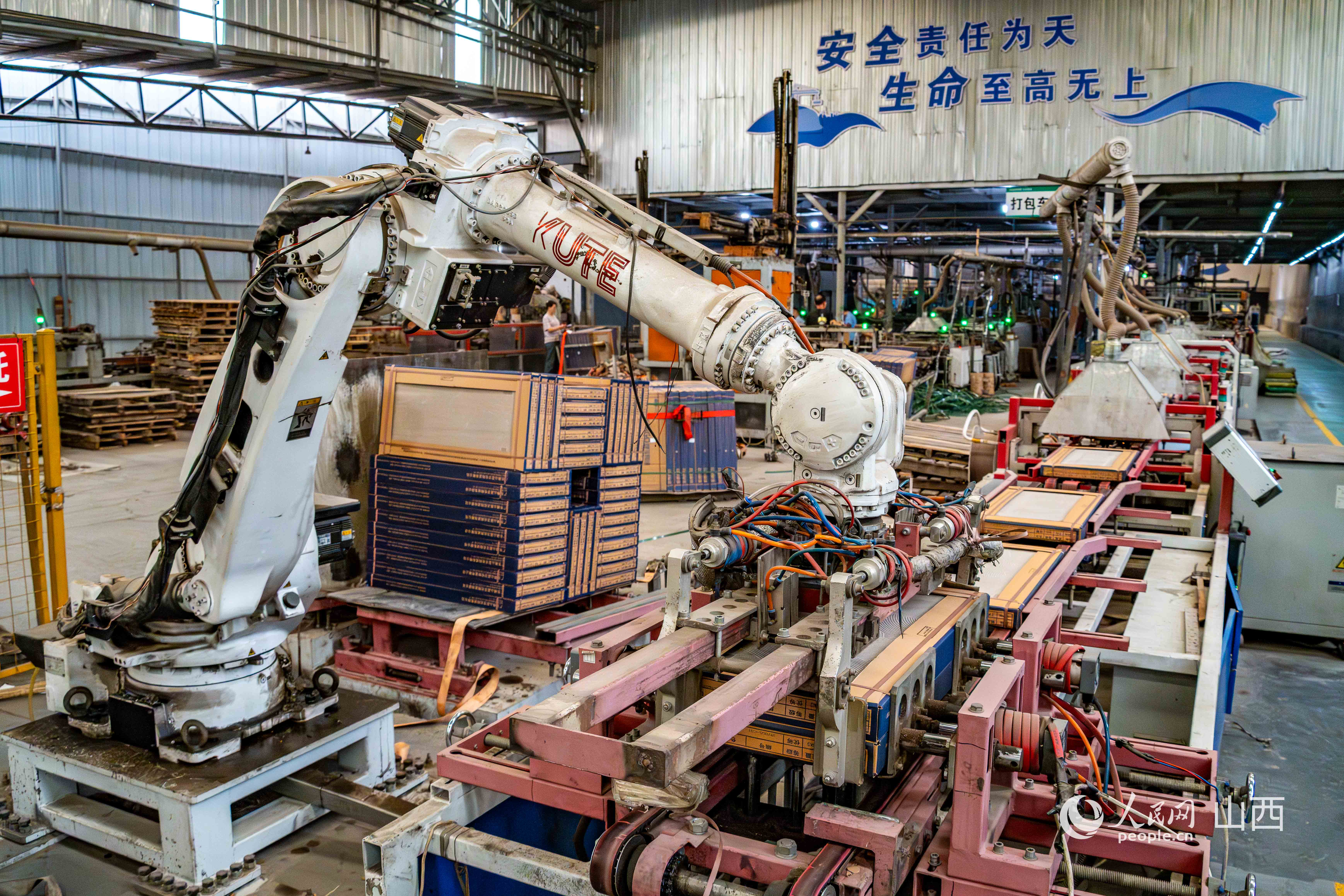 華冠陶瓷有限公司的生產(chǎn)車(chē)間,機(jī)械臂正在打包裝箱。人民網(wǎng) 馬夢(mèng)迪攝