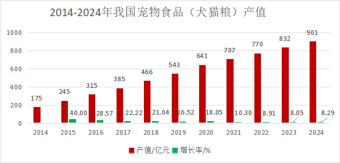 中國農(nóng)業(yè)科學(xué)院飼料研究所寵物營養(yǎng)團(tuán)隊數(shù)據(jù)統(tǒng)計顯示,2024年我國寵物犬貓飼養(yǎng)量達(dá)1.4億只,寵物產(chǎn)業(yè)總規(guī)模突破3000億元,其中寵物食品市場占比最高。到2024年,寵物食品犬貓糧市場規(guī)模達(dá)到900億元,比2023年增長8.3%。