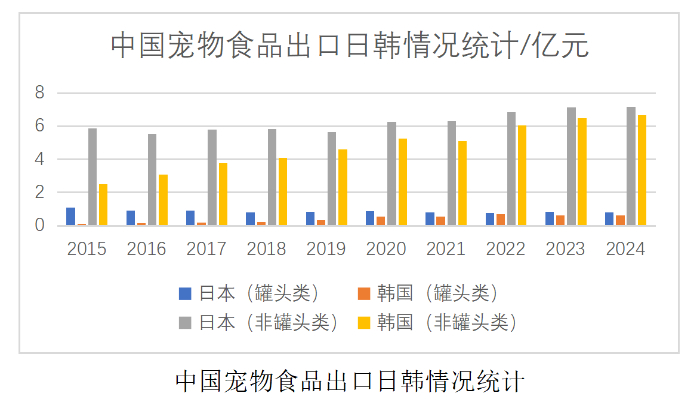 王金全分析認(rèn)為,日韓是我國寵物食品重要出口地,2022年占出口總額12%,中國品牌憑性價比與差異化切入日本市場,2024年對韓非罐裝類出口額較2015年翻倍。