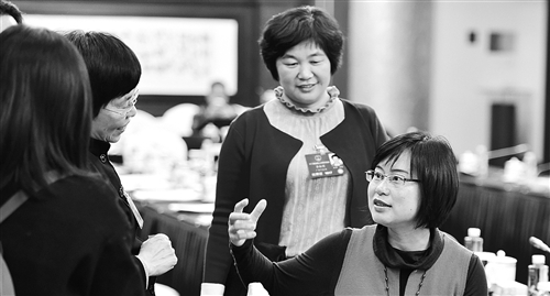3月11日,人大廣東代表團(tuán)在駐地舉行分組會(huì)議。全國人大代表龍芳(右一)、李淑明(右二)與同團(tuán)代表在討論“一帶一路”戰(zhàn)略對(duì)廣東企業(yè)“走出去”產(chǎn)生的影響。本報(bào)記者 李景錄攝