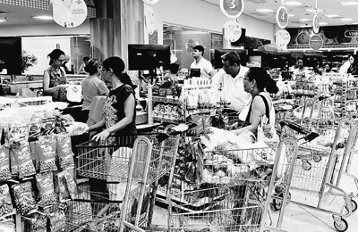 由于巴西通貨膨脹攀升導(dǎo)致消費(fèi)不振,民眾購物更趨謹(jǐn)慎。圖為在里約熱內(nèi)盧一家超市,當(dāng)?shù)孛癖娫诓少徤畋匦杵?。記?顏 歡攝