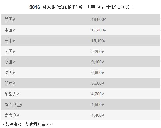 2016全球十大最富國(guó)家出爐:美國(guó)居首 中國(guó)第二