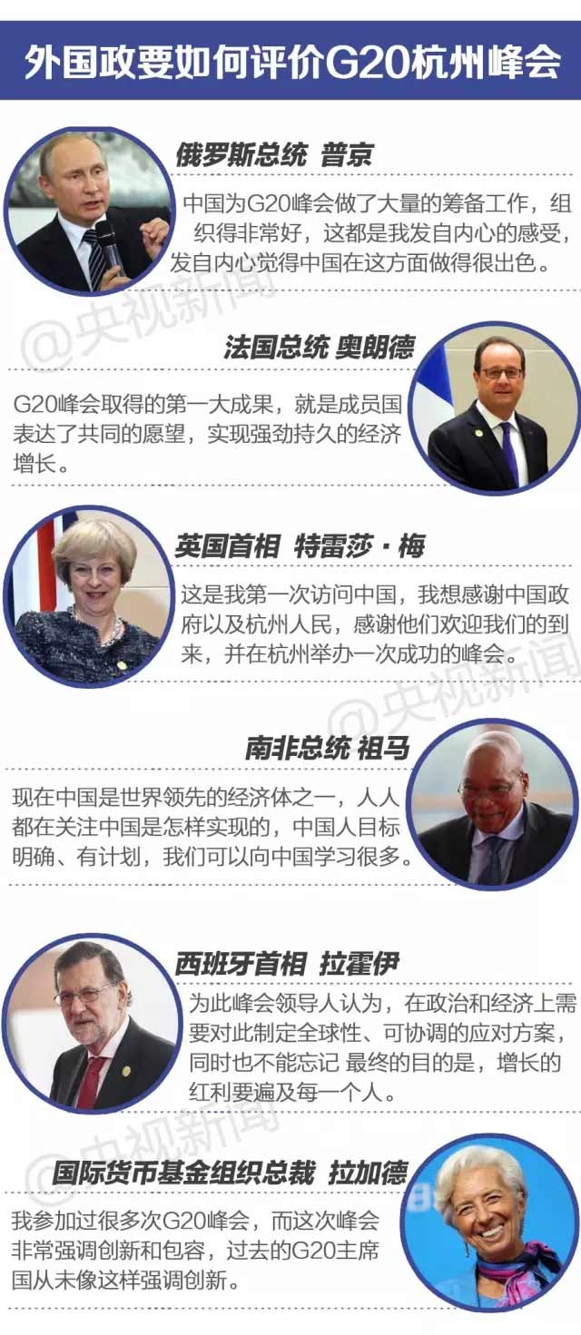 各方高度贊揚(yáng)杭州峰會(huì)的共識(shí),感謝中國舉辦會(huì)議的付出。一些與會(huì)領(lǐng)導(dǎo)人還肯定了中國的發(fā)展成就以及中國經(jīng)濟(jì)發(fā)展對(duì)全球經(jīng)濟(jì)的影響,明確表示愿與中國加強(qiáng)合作的意愿。杭州峰會(huì)使G20進(jìn)入升級(jí)版,使中國成為G20中舉足輕重的角色。