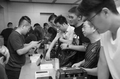 iPhone7開賣后受追捧,圖為開賣首日華貿(mào)蘋果店現(xiàn)場。京華時報記者陶冉攝