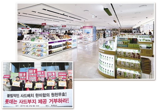 左圖 2月27日,韓國民眾在位于首爾的樂天集團總部前舉行抗議示威活動,并高舉反對樂天出讓“薩德”用地的標語。 新華社發(fā)