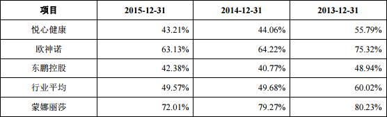 另外,由于去年6月,在香港上市三年的東鵬控股正式從香港退市。因此,東鵬控股2016年資產(chǎn)負(fù)債率暫無法對(duì)比。另一競(jìng)爭(zhēng)對(duì)手悅心健康2014年至2016年的資產(chǎn)負(fù)債率分別為44.06%、43.21%、43.60%,這份數(shù)據(jù)更是遠(yuǎn)低于蒙娜麗莎。