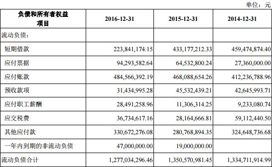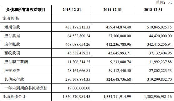 招股書數(shù)據(jù)顯示,蒙娜麗莎2013年至2016年負(fù)債總計(jì)分別為13.27億元、14.22億元、14.15億元、13.56億元;流動(dòng)負(fù)債分別為13.03億元、13.35億元、13.51億元、12.77億元。