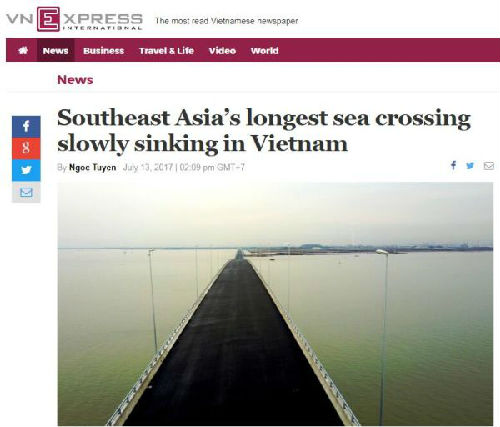 這座橋號(hào)稱是東南亞最長的跨海大橋,路線全長約15公里,是日本援助了10萬億越盾(約合人民幣30億元)修建的。不過現(xiàn)在,工程尚未完全竣工,但越南媒體報(bào)道稱,這座橋好像看上去正在“緩緩下沉”。