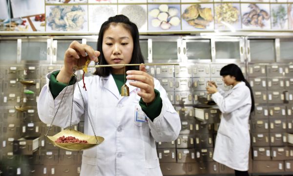 資料圖:2016年12月21日,在河北涉縣中醫(yī)院中藥房內(nèi),工作人員忙著為顧客配制冬季進補類中草藥。 新華社記者 王曉 攝