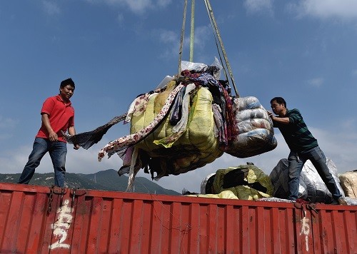 資料圖:在深圳海關(guān)開展的一次“洋垃圾”銷毀行動中,工作人員在搬運(yùn)走私廢舊衣物。(馬來西亞《星洲日報》網(wǎng)站)