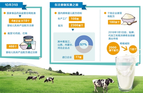 根據(jù)食藥監(jiān)總局公布的數(shù)據(jù),在注冊制實施之前,國內(nèi)擁有嬰兒配方奶粉生產(chǎn)工廠108家、配方2300多個,其中黑龍江、山西、內(nèi)蒙古、河北企業(yè)占57%,進口企業(yè)77家。按照新要求,一家企業(yè)最多可擁有3個配方系列的9個配方計算,配方注冊才剛剛開始。