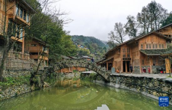 3月18日,在貴州省榕江縣栽麻鎮(zhèn)大利侗寨,村民從月亮山居民宿的小石橋上經(jīng)過(無人機(jī)照片)。