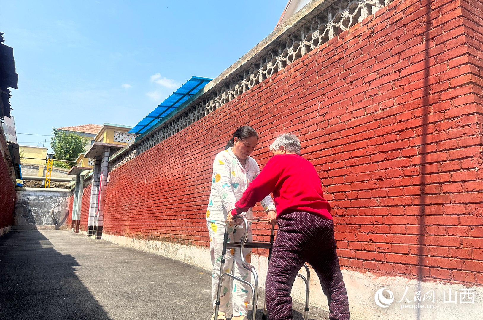 臨近中午,暖陽(yáng)正好。村民李連香正扶著77歲的母親康復(fù)訓(xùn)練。李連香微微將助步器向前移動(dòng),母親跟著緩緩向前。跟母親聊聊小時(shí)候的故事,問問她想吃什么……一言一語(yǔ)間,母女二人面對(duì)面慢慢移動(dòng)著,走累了,就原地歇一會(huì)。