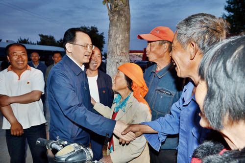 圖為省人大常委會(huì)副主任、市委書記李俊明在偏關(guān)縣高家上石會(huì)村駐村時(shí)和街頭群眾共話脫貧增收大計(jì)。(本報(bào)記者 宮愛文 攝)