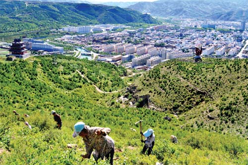 岢嵐縣貧困戶受聘林業(yè)專業(yè)合作社在嵐漪鎮(zhèn)東街村東山種植油松,辛勤織綠,美化家鄉(xiāng)增創(chuàng)收。宮清華 攝