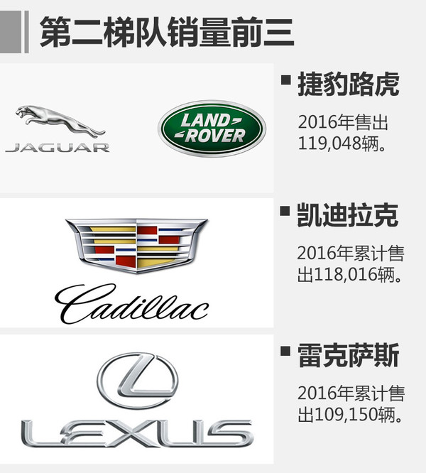 而包括捷豹路虎、凱迪拉克、雷克薩斯、沃爾沃、英菲尼迪、林肯和謳歌組成的豪華品牌第二梯隊(duì),2016年總銷量為520,354輛,占整個(gè)豪華車市場23.9%。注:保時(shí)捷品牌定位問題,不算在第二梯隊(duì)內(nèi)。