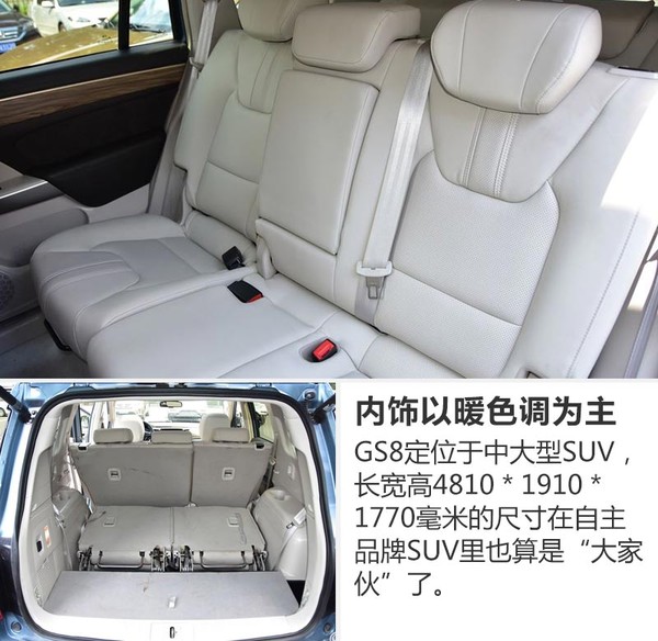 GS8的設計由原奔馳設計師張帆操刀,在內飾部分也較為洞察國內消費者的喜好。車內整體寬敞舒適,顏色采用偏暖的木色,打造一種家用溫馨感??臻g方面,GS8的長寬高分別為4810*1910*1770毫米,軸距2800毫米,采用7座布局。