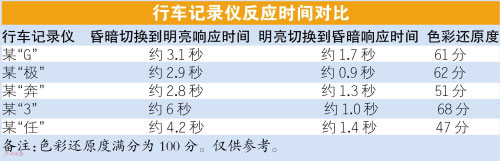 此次測試,車天下君準備一個“黑盒子”,里面放置一個屏幕常亮的智能手機。在“黑盒子”外面,放置另外一個屏幕常亮的智能手機。切換時間控制在0.3秒之內(nèi),分為“明到暗”和“暗到明”兩個環(huán)節(jié),記錄行車記錄儀場景切換時的響應(yīng)時間。由測試結(jié)果一覽表可以看到,參與測試5個型號的行車記錄儀的響應(yīng)時間都不盡相同:短則1秒,長則6秒。車天下君歸納如下,質(zhì)量合格的行車記錄儀從昏暗切換到明亮環(huán)境的響應(yīng)時間應(yīng)在3~4秒之間,從明亮切換到昏暗環(huán)境當中的響應(yīng)時間應(yīng)該在1~2秒之內(nèi)。