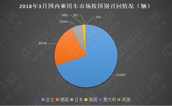 分國別來看,3月發(fā)布召回公告的13個品牌中:自主共1個品牌召回汽車252087輛,占總召回量69.87%,召回數(shù)量最大;其次,德系3個品牌累計召回汽車80788輛,占比22.39%;接下來,日系共4個品牌累計召回汽車21049輛,占比5.83%;之后,美系2品牌召回汽車5963輛,占比1.65%;意大利和英系各自召回汽車581輛和306輛,分別占比0.16%和0.08%。