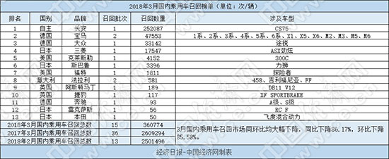 根據(jù)國家質(zhì)檢總局缺陷產(chǎn)品管理中心3月份發(fā)布的召回公告,經(jīng)濟日報-中國經(jīng)濟網(wǎng)汽車頻道經(jīng)過匯總、統(tǒng)計,整理出“2018年3月國內(nèi)乘用車召回榜單”。3月,國內(nèi)乘用車市場共有13個品牌發(fā)布15次召回公告,累計召回汽車360774輛,召回數(shù)量同環(huán)比均出現(xiàn)大幅下降,其中同比下降86.17%,環(huán)比下降85.58%。