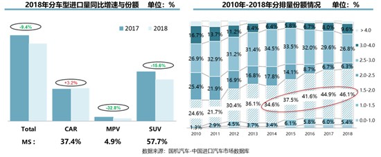 再以車型分類來看,2018年,三大進口車型的銷量出現(xiàn)明顯分化。其中,轎車銷量增長3.2%,是唯一保持增長的車型;SUV的銷量占比雖達到57.7%,但其銷量卻出現(xiàn)15.6%的明顯下滑;MPV更是大幅下降32.8%。此外,進口車排量下移也成為趨勢,1.5升-2.0升排量進口車的銷量占比從2014年的34.6%升至46.1%,達到較高水平;與之相對,3.0升-4.0升排量進口車銷量則出現(xiàn)較明顯的下滑。