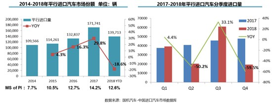 聚焦平行進口車市場,2018年,平行進口汽車銷量出現(xiàn)了5年來的首次下滑,且市場波動明顯。2018年,平行進口車銷量占進口車總銷量的12.6%,達13.97萬輛,同比下滑18.6%,下滑幅度遠超進口車市場整體表現(xiàn)。而中美貿(mào)易摩擦、國內(nèi)對車輛環(huán)保要求更為嚴格等因素,也導(dǎo)致平行進口車的銷量走低。各個季度的表現(xiàn)則更能體現(xiàn)該市場的巨幅波動,其中,平行進口車一季度銷量同比增長4.4%,表現(xiàn)穩(wěn)定;二季度卻出現(xiàn)50.2%的大幅下滑;三季度報復(fù)性回漲33.1%,四季度依舊疲軟;最終,平行進口車在2018年全年的銷量呈現(xiàn)大幅下滑的局面。