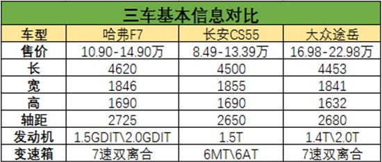 動力部分,途岳提供了1.4T+2.0T的發(fā)動機可供選擇,其中,1.4T發(fā)動機的最大馬力為150匹,峰值扭矩250N.m;2.0T發(fā)動機的最大馬力為186匹,峰值扭矩320 N.m,傳動方面,兩款發(fā)動機均匹配的是7速雙離合變速箱。單就動力參數(shù)來看,很明顯,今天推薦的三款車中,哈弗F7優(yōu)勢最大,途岳次之。但同樣拿出頂配的2.0T車型對比,途岳不僅配置不如哈弗F7,售價也要高上小十萬元。 雖然途岳被看做是途觀的繼任者,但兩款車在造型上還是很好區(qū)分的,途岳用上了大眾SUV全新的設計理念,看起來更像是小一號的途昂,但途岳要想達到此前途觀的市場地位,明顯還有很長的路要走。