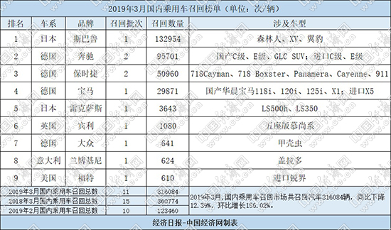 根據(jù)國(guó)家市場(chǎng)監(jiān)督管理總局缺陷產(chǎn)品管理中心3月份發(fā)布的召回公告,經(jīng)濟(jì)日?qǐng)?bào)-中國(guó)經(jīng)濟(jì)網(wǎng)汽車頻道經(jīng)過(guò)匯總、統(tǒng)計(jì),整理出“2019年3月國(guó)內(nèi)乘用車召回榜單”。3月,國(guó)內(nèi)乘用車市場(chǎng)共有9個(gè)品牌累計(jì)發(fā)布9起召回公告,共計(jì)召回汽車316084輛,同比下降12.39%,環(huán)比增長(zhǎng)156.02%。