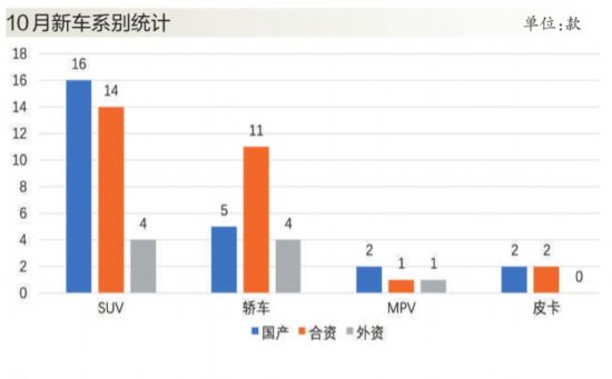 10月有34款SUV新車上市,占比由上月的57%微降至55%。轎車新車共有20款,占比由上月的34%降至32%。10月上市的MPV和皮卡均為4款,MPV車型占比同樣有小幅下滑,但全新車型比較吸引眼球。自2017年以來,國內(nèi)MPV市場(chǎng)持續(xù)較大幅度下滑,即便是過去一枝獨(dú)秀的上汽通用五菱也在今年出現(xiàn)了下滑。面對(duì)慘淡的車市,一直主攻低端市場(chǎng)的上汽通用五菱推出五菱宏光的升級(jí)版五菱宏光PLUS,其整體設(shè)計(jì)更為年輕、時(shí)尚,完全顛覆了以往消費(fèi)者對(duì)其產(chǎn)品的廉價(jià)印象。而皮卡新車占比為6%,是惟一實(shí)現(xiàn)占比正增長的車型類別,其中,長安凱程F70是長安與PSA集團(tuán)合作開發(fā)的全新皮卡產(chǎn)品。
