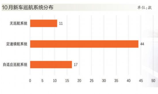 自適應(yīng)巡航系統(tǒng)在緩解疲勞和保障安全上有明顯優(yōu)勢(shì),在10月上市車型中,搭載該系統(tǒng)的新車有17款,如新款東風(fēng)日產(chǎn)天籟、一汽豐田榮放、長安CS35、WEY VV5、吉利遠(yuǎn)景X6以及理想ONE等車型,均搭載有自適應(yīng)巡航系統(tǒng),甚至是全速自適應(yīng)巡航系統(tǒng)。與以往相比,自適應(yīng)巡航技術(shù)的滲透率有所提升,而定速巡航的應(yīng)用則更為廣泛,在各級(jí)別車型中均有分布。10月,搭載定速巡航的新車總數(shù)為44款,而不搭載任何巡航系統(tǒng)的車型共有11款,主要體現(xiàn)在定位較低車型上。