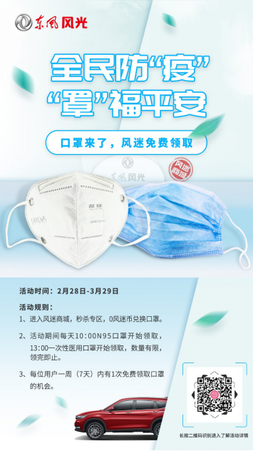 針對疫情期間“一罩難求”的問題,東風小康公司推出了“萬只口罩限量免費領取”活動,從現(xiàn)在至3月29日,風迷商城將每天免費送出100份N95、一次性醫(yī)用口罩,為用戶獻上專屬關愛。
