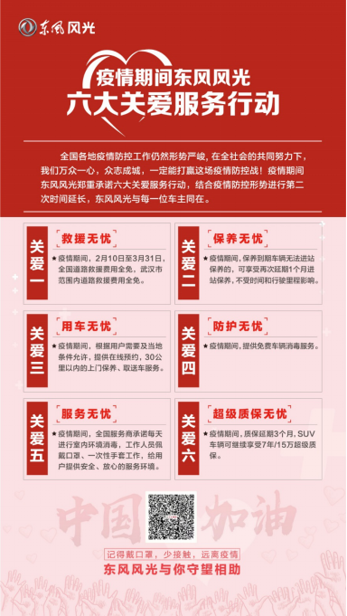 同時,東風小康公司旗下東風風光品牌還針對疫情特別推出“為愛同行,風光助行”購車補貼全套解決方案,用戶線上支付99元訂車,即可抵扣1000-3000元現(xiàn)金,另享金融貼息至高8000元,低首付、零利息、包牌貸任選,同時置換購車尊享補貼至高10000元。此外,針對東風風光車主,東風風光品牌還推出了包括疫情期間道路救援費用全免、保養(yǎng)延期3個月、提供在線預約、上門保養(yǎng)、取送車服務等六大關愛政策,從救援、延保、用車、服務等全方位為用戶提供出行便利及保障。