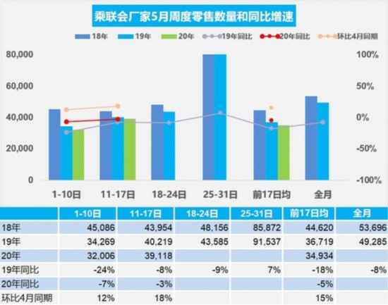 乘聯(lián)會20日發(fā)布的數(shù)據(jù)顯示,5月第二周(11-17日)的乘用車市場零售表現(xiàn)改善,環(huán)比增長18%,相對前期5月第二周的環(huán)比增長放緩的情況,今年的5月零售走勢回暖的態(tài)勢明顯。