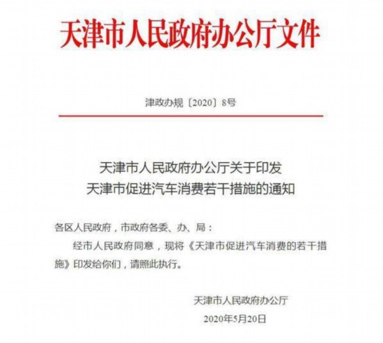 5月20日,天津市人民政府辦公廳印發(fā)《天津市促進汽車消費的若干措施》(以下簡稱《措施》),2020年內(nèi)新增小客車個人增量指標(biāo)配置額度35000個。
