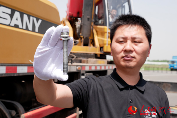 現(xiàn)場,工作人員演示將一顆螺栓從一輛行駛5萬公里的實(shí)驗(yàn)車上拆下一顆重164克、長112.9毫米的螺栓。隨后,將該螺栓作為受力點(diǎn)固定,借助吊機(jī),將重達(dá)10噸的房子吊起2米高度,停留5分鐘后,螺栓不變形、不磨損。