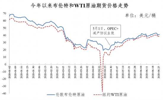 其中,4月20日紐約WTI原油5月合約臨近交割前甚至跌至每桶-37.63美元的負(fù)值。極低油價(jià)給沙特、俄羅斯等主要產(chǎn)油國帶來沉重壓力,并促使各方達(dá)成新一輪歷史性最大力度減產(chǎn)協(xié)議。隨著5月OPEC+正式推進(jìn)減產(chǎn),美國等產(chǎn)油國在低油價(jià)下產(chǎn)量也出現(xiàn)下降,以及更多海外國家放寬疫情管制,需求預(yù)期得到改善,國際油價(jià)逐步回升。目前,倫敦布倫特和紐約WTI油價(jià)升至每桶41美元和39美元的水平。