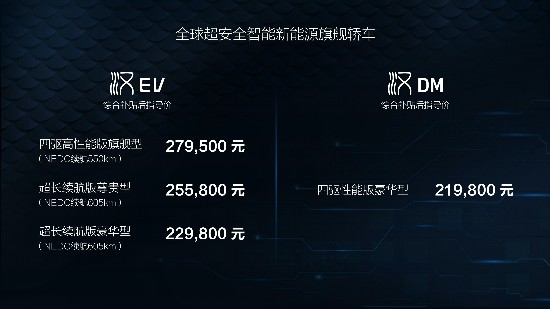 7月12日,比亞迪宣布“全球超安全智能新能源旗艦轎車”漢正式上市,上市車型包含三款漢EV和一款漢DM。全國綜合補貼后,漢EV超長續(xù)航版豪華型售價22.98萬元、漢EV超長續(xù)航版尊貴型售價25.58萬元、漢EV四驅高性能版旗艦型售價27.95萬元;漢DM四驅性能版豪華型售價21.98萬元。