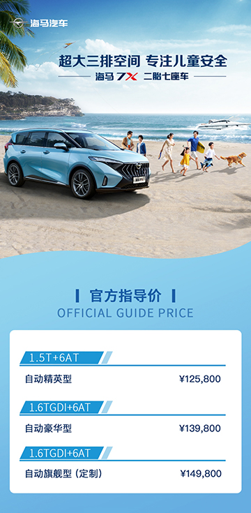 8月23日,海馬汽車(chē)旗下全新MPV海馬7X正式上市,共推出搭載1.5T/1.6TGDI兩款動(dòng)力的三款車(chē)型,售價(jià)區(qū)間12.58-14.98萬(wàn)元。