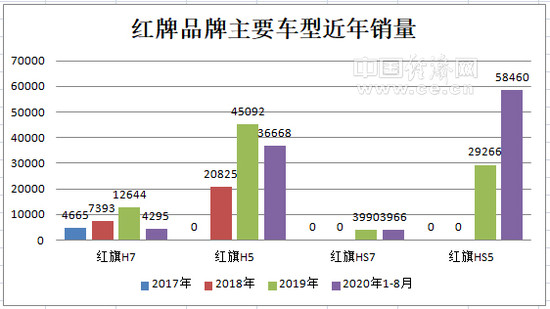 2019年7月、8月,紅旗HS7、純電動SUV車型E-HS3接踵而至。其中,紅旗HS7雖然只提供了3.0T+8AT一種動力選擇,但在2019年也貢獻(xiàn)了近4000輛的銷量。這足以證明紅旗HS7的市場潛力。HS7、HS5以及E-HS3的集中上市,不僅讓紅旗快速彌補(bǔ)了在車型矩陣上的短板,更讓其實現(xiàn)了銷量里程碑式的突破。2019年,紅旗銷量突破10萬輛達(dá)100166輛,同比大幅增長203%。