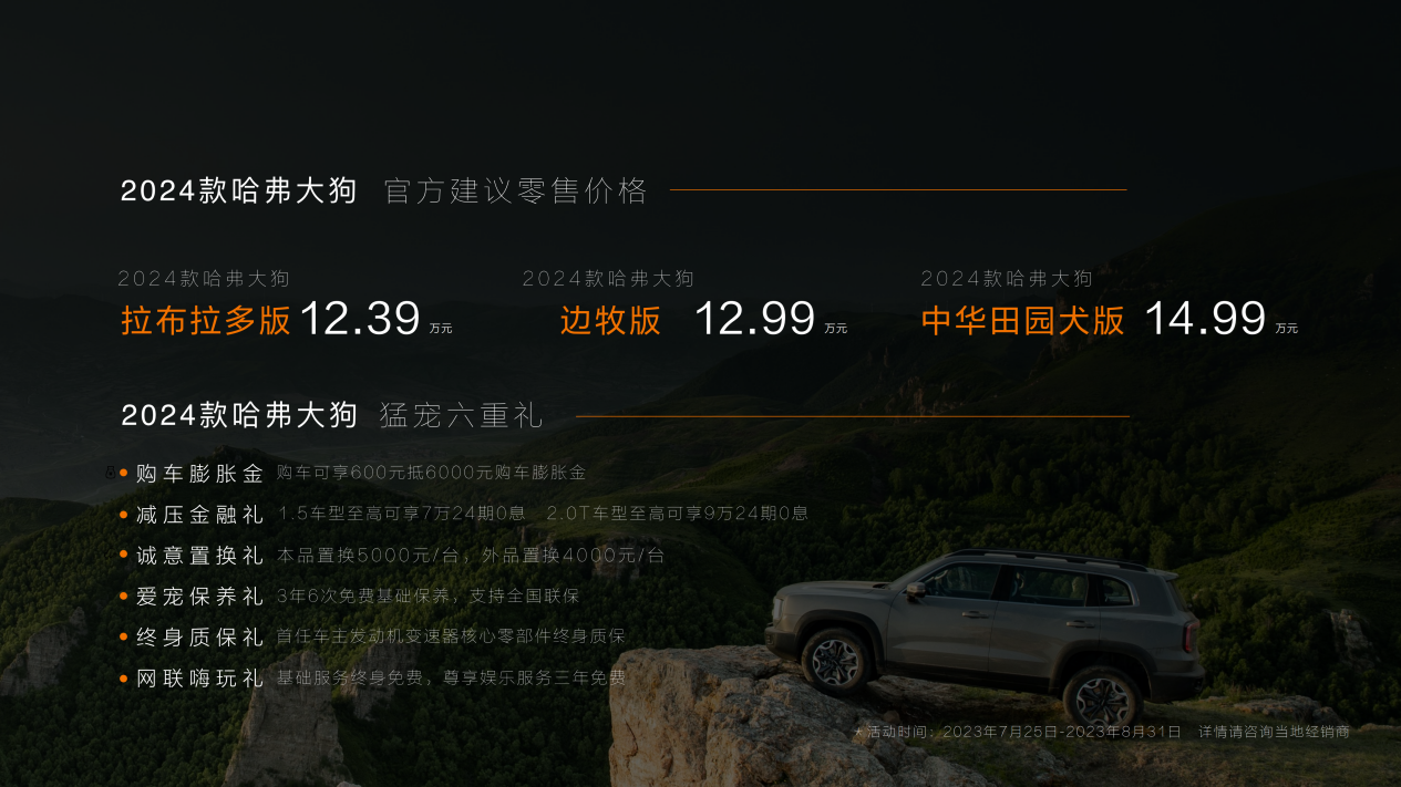 央廣網(wǎng)北京7月26日消息,昨天2024款哈弗大狗正式上市,新車共推出三款車型。2024款哈弗大狗不斷超越自我,在外觀、動力、智能等方面的全面進階,旨在強勢接力輕越野引領(lǐng)者的產(chǎn)品使命,在穩(wěn)固輕越野賽道產(chǎn)品地位的同時,不斷征服更為廣闊的市場藍海。