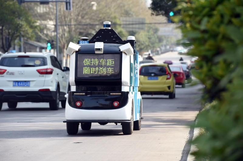 資料圖片:2022年3月15日,一輛無人配送車在合肥高新區(qū)進(jìn)行公開道路測(cè)試。新華社記者 周牧 攝