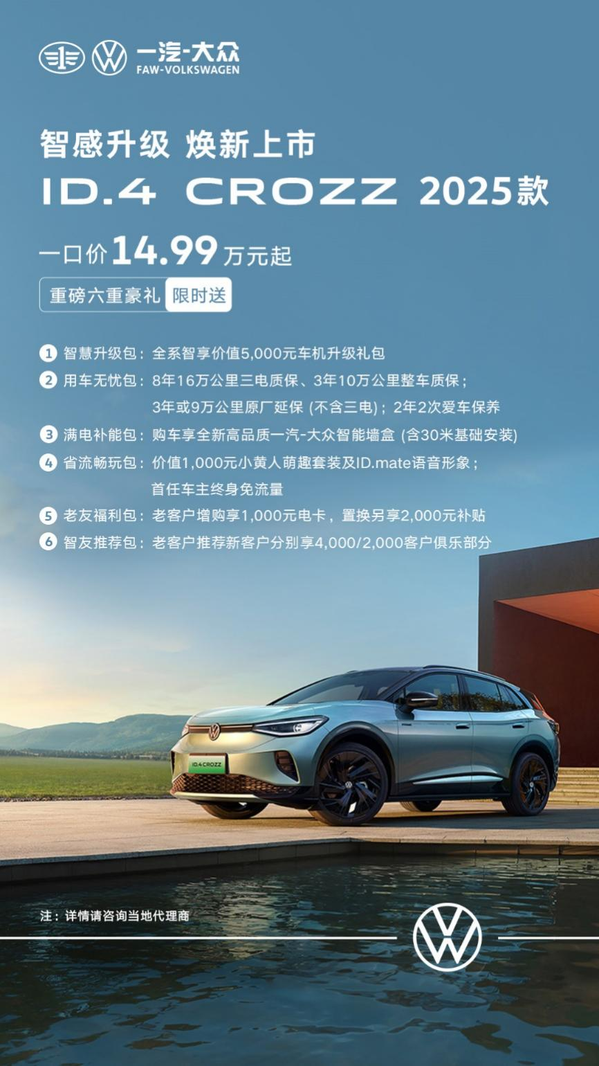 2025年1月3日,一汽-大眾ID.4 CROZZ 2025款正式上市,一口價14.99萬元起。此次煥新升級,ID.4 CROZZ 2025款在內(nèi)外飾設(shè)計(jì)、智能座艙、智能駕駛輔助、動力性能及舒適配置上實(shí)現(xiàn)了五大維度的全面升級,為消費(fèi)者帶來全新的駕乘體驗(yàn)。