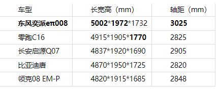 家庭出游的核心訴求是“全員舒適”,空間表現(xiàn)直接影響乘坐體驗。在這一點上,東風奕派eπ008交出了亮眼答卷,超5米的車長(5002mm)與超3米的軸距(3025mm)全面碾壓同級競品。五款車型中,東風奕派eπ008是唯一一款車長超過5米、軸距超過3米的車型。更高級別的車長和軸距,帶來了更充裕的縱向空間,確保每位乘客皆可舒展身姿,盡享愜意旅途。