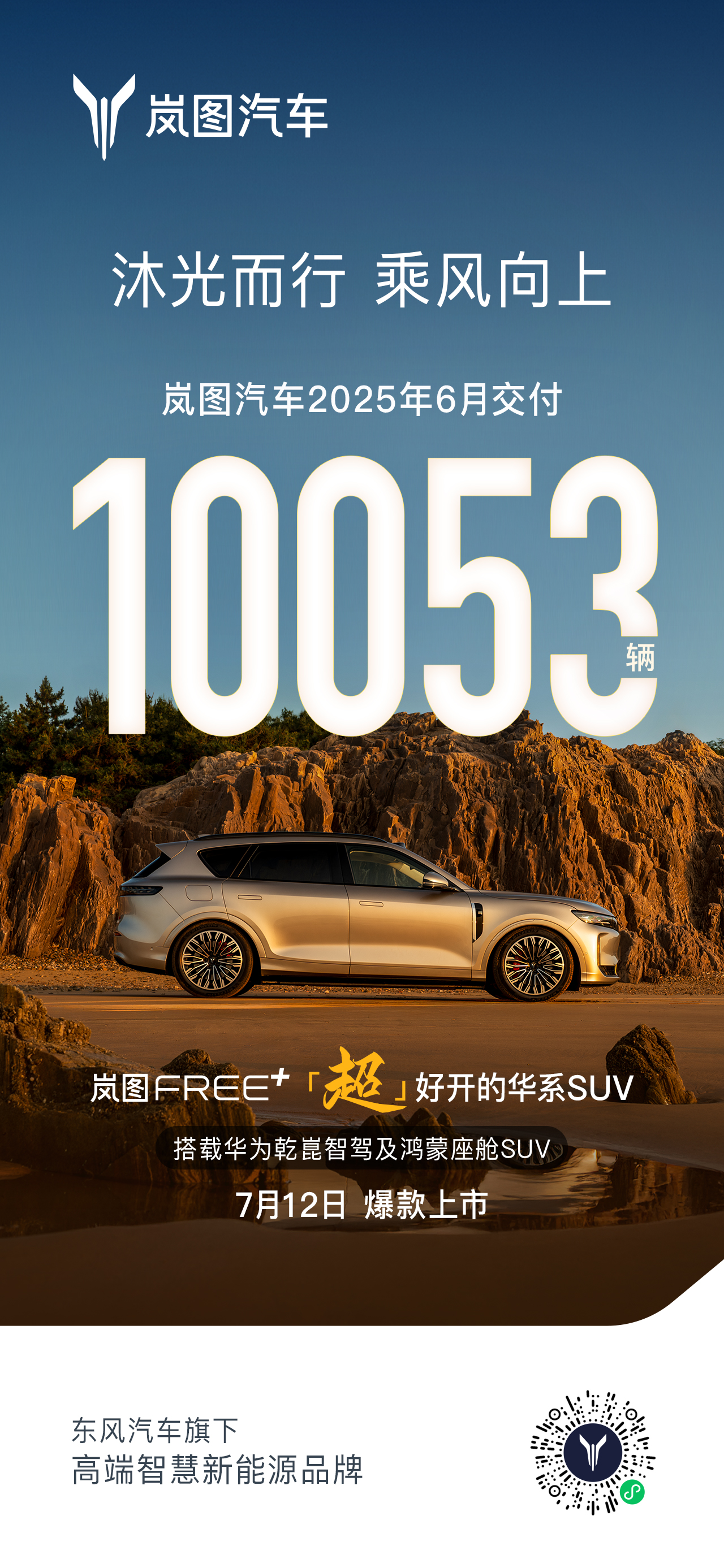 7月1日,嵐圖汽車公布上月銷量數(shù)據(jù)。6月,嵐圖汽車單月銷量達(dá)10053輛,同比增長83%。1—6月,嵐圖汽車?yán)塾嬩N量達(dá)56128輛,同比增長85%。在高端新能源MPV領(lǐng)域,爆款嵐圖夢想家站穩(wěn)冠軍。嵐圖另一款“聽勸”的爆款產(chǎn)品,嵐圖FREE+也在火熱預(yù)售中。從強(qiáng)勢發(fā)展勢頭來看,嵐圖“智慧 品位 信賴”的品牌形象已經(jīng)贏得新時代中堅力量認(rèn)可,正在全面鞏固夯實央國企高端新能源第一品牌地位。