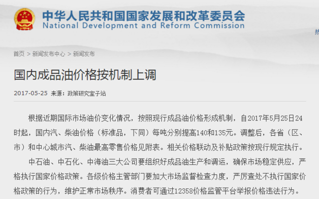昨日(25日),國家發(fā)展和改革委員會發(fā)布消息稱,根據(jù)近期國際市場油價變化情況,按照現(xiàn)行成品油價格形成機制,自2017年5月25日24時起,國內(nèi)汽、柴油價格(標準品,下同)每噸分別提高140和135元。相關價格聯(lián)動及補貼政策按現(xiàn)行規(guī)定執(zhí)行。