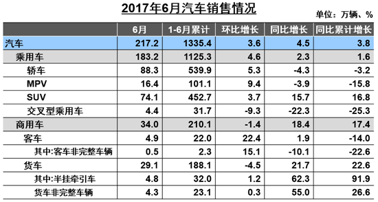 6月,我國汽車產(chǎn)銷分別為216.7萬輛和217.2萬輛,環(huán)比分別增長3.9%和3.6%,同比分別增長5.4%和4.5%。上半年,我國汽車產(chǎn)銷分別為1352.6萬輛和1335.4萬輛,比上年同期分別增長4.6%和3.8%,低于上年同期1.9和4.3個百分點。