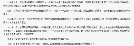 2011年6月,一汽股份成立之初,曾向一汽轎車和一汽夏利作出不可撤銷承諾:在一汽股份成立后五年內(nèi)通過資產(chǎn)重組或其他方式整合所屬的轎車整車生產(chǎn)業(yè)務,以解決同業(yè)競爭問題。但五年過去了,這一問題并未得到解決,在2016年6月28日,一汽轎車和一汽夏利同時發(fā)布公告稱,一汽股份原計劃在五年內(nèi)解決其與子公司一汽轎車、一汽夏利同業(yè)競爭的承諾無法履行,將承諾期再度延遲三年作為過渡期,而上述承諾的截止日期,也就是2019年6月28日。