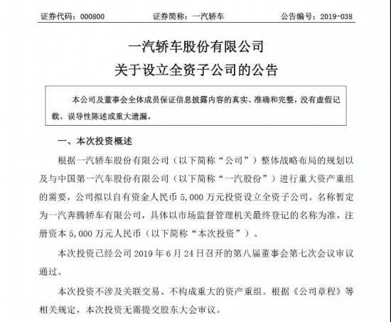 6月25日,一汽轎車正式發(fā)布了《一汽轎車股份有限公司關于設立全資子公司的公告》,提出“擬以自有資金人民幣5000萬元投資設立全資子公司”,名稱暫定為“一汽奔騰轎車有限公司”。按照此前發(fā)布的《一汽轎車股份有限公司重大資產(chǎn)置換及發(fā)行股份和可轉換債券、支付現(xiàn)金購買資產(chǎn)并募集配套資金暨關聯(lián)交易預案》,此次成立的“一汽奔騰轎車有限公司”在接受了一汽轎車的“置出資產(chǎn)”后,其100%股權將過戶至一汽股份。至此,一汽轎車的主營業(yè)務將從“乘用車的開發(fā)、制造和銷售”徹底變更為“商用車的開發(fā)、制造和銷售”,與一汽夏利間的同業(yè)競爭問題,即將徹底得到解決。