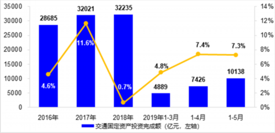 1-5月,交通固定資產投資完成10138億元,同比增長7.3%,較去年全年加快6.6個百分點。公路水路完成投資7537億元,同比增長4.8%,其中公路、內河、沿海分別完成投資7115億元、215億元和196億元,同比分別增長4.5%、14.7%和8.1%。