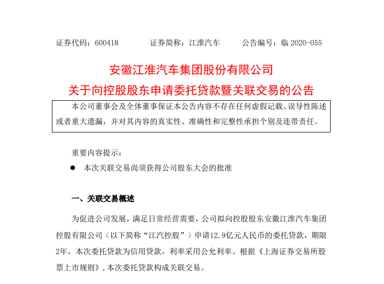 同日,江淮汽車還發(fā)布了向控股股東申請委托貸款的公告。公告顯示,為促進公司發(fā)展,滿足日常經(jīng)營需要,公司擬向控股股東安徽江淮汽車集團控股有限公司申請12.9億元人民幣的委托貸款,期限2年。